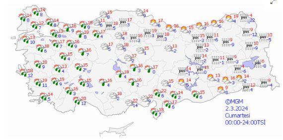 Meteoroloji Genel Müdürlüğü tarafından yapılan son tahminlere göre ülkemizin batı kesimlerinin parçalı ve yer yer çok bulutlu, Marmara, Ege, Batı Akdeniz ile Eskişehir, Bolu ve Düzce çevrelerinin sağanak ve yer yer gök gürültülü sağanak yağışlı, diğer yerlerin az bulutlu ve açık geçeceği tahmin ediliyor.