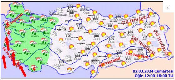 Marmara ve Güneydoğu Anadolu’da toz taşınımı bekleniyor. İç ve doğu kesimlerde pus ve yer yer sis, doğu kesimlerde buzlanma ve don olayı görüleceği tahmin ediliyor. Doğu Karadeniz’in iç kesimleri ile Doğu Anadolu’nun kuzey ve doğusunda çığ tehlikesi bulunmaktadır.