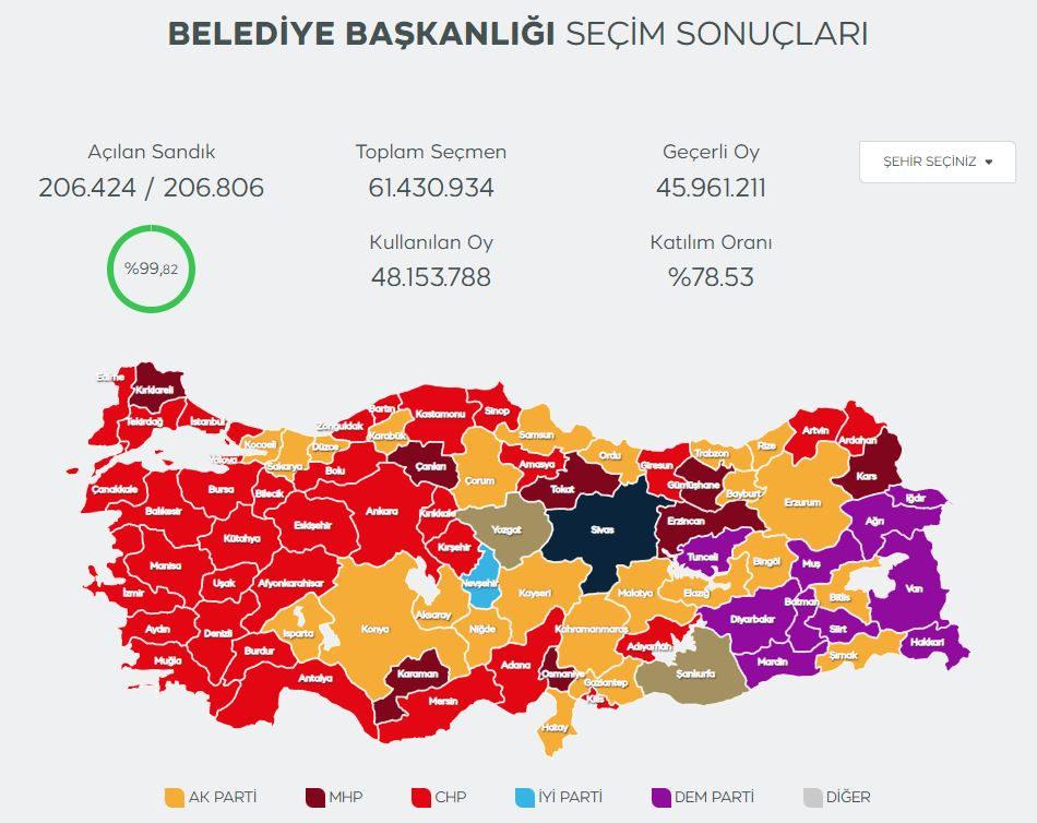 Kesin olmayan sonuçlara göre Türkiye geneli Belediye Başkanlığında; CHP 35, AK Parti 24, DEM 10, MHP 8, Yeniden Refah Partisi 2, BBP 1, İYİ Parti 1 belediye başkanlığı kazanmıştır.