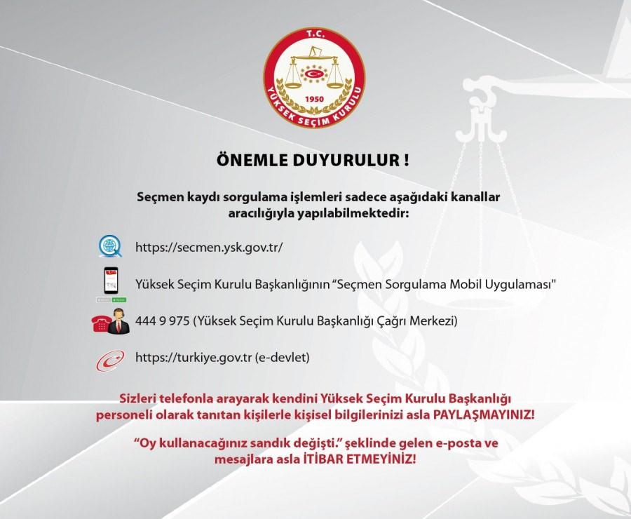 Seçmenler, nerede ve hangi sandıkta oy kullanacağını, YSK’nın internet sitesinden, e-Devlet kapısından, YSK’nin Seçmen Sorgulama Mobil Uygulamasından veya 444 9 975 numaralı YSK Çağrı Merkezi’nden kontrol edebilecek.