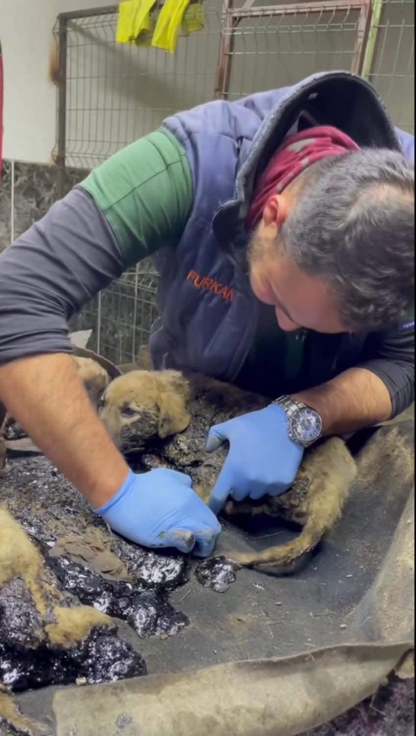 • Zifte bulanmış 10 yavru köpek, bebek ve zeytinyağı ile temizlendi